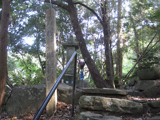 「史跡 板屋九郎兵衛の墓」の柱があり、黒い手すりのある細い道を登ります。
